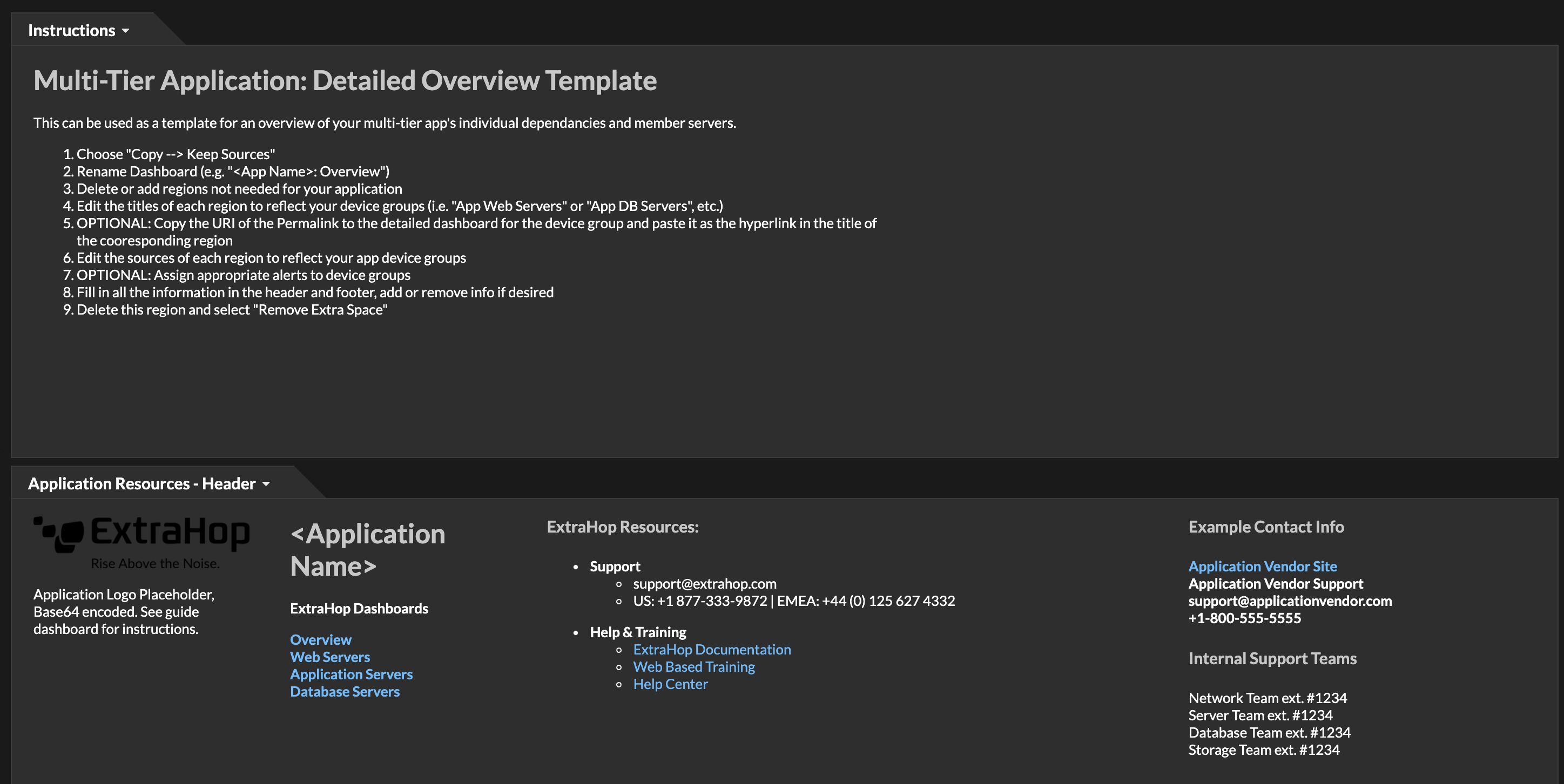 Quickly build informative and user-friendly dashboards in ExtraHop for application stacks using this collection of dashboard templates. The Dashboard Starter Kit includes a user guide dashboard and a suite of dynamic dashboards for your HTTP/TLS, DB, CIFS, and LDAP servers. A full application stack overview dashboard example template is also included. Once ready to move away from full templates, take advantage of this bundle's collection of KPI-focused region templates that serve as building blocks for personalized custom dashboards.